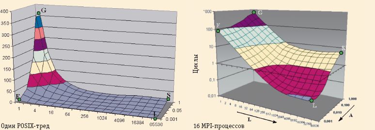 На рис. 3 дана APEX-поверхность для одного POSIX-треда, в которой выделены точки G, L, S и А c предельными значениями пространственно-временной локализации (ось L — это изменяемая пространственная локализация, а ось A — изменяемая временная локализация, направление стрелки показывает увеличение локализации). Главный полученный результат для платы с микропроцессорами Barcelona — при увеличении параллелизма (количества тредов до 64) резко уменьшаются задержки в точке G, с 360 тактов до 47. При этом уменьшение происходило даже тогда, когда количество тредов превышало количество ядер процессоров платы. Похожего уменьшения количества тактов для платы с микропроцессором Clovertown не наблюдалось — для одного треда задержка была около 280 тактов, а на 16 тредах — 70 тактов, на этом уменьшение задержки прекратилось.
