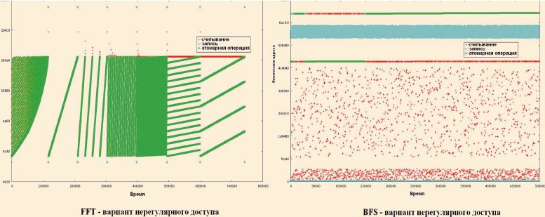 Степень нерегулярности работы с памятью на тесте GUPS — не такая уж абстракция, как утверждают некоторые апологеты вычислительных средств с традиционной архитектурой. На рис. 2 показаны профили обращений к памяти задач быстрого преобразования Фурье (FFT) и задачи поиска вширь на графе (BFS). Излишне напоминать, что первая — это задача из области обработки сигналов и изображений, решаемая, в частности, в изделиях навигации и целенаведения, а вторая — типичный инструмент анализа разведывательных данных, построения систем борьбы с терроризмом и построения сложных систем управления.