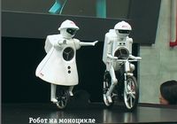 Инженер выкатил робота на моноцикле на сцену, осторожно поставил его и медленно отвел руки. Робот, почти как человек, поддерживал равновесие легкими движениями вперед и назад. Затем он сумел даже проехать по прямой. Правда, поворотов робот продемонстрировать пока не может. С технической точки зрения это гораздо труднее, тем более при езде на одном колесе.