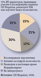 Так, в этом году лишь 25% из числа организаций-респондентов планируют переход на SOA в первый раз — в прошлом году их было 53%. Соответственно, до 16% возросла по сравнению с 7% в 2007 году доля компаний, не выказывающих вовсе никакого интереса к SOA. Вместе с тем 53% крупных компаний уже использовали в своей практике SOA, 20% — находятся в процессе перехода и столько же планируют внедрение SOA в течение ближайших 12 месяцев. Как отмечают в Gartner, двумя основными причинами нежелания следовать модели SOA выступают недостаток нужных для этого компетенций и опыта у сотрудников и неочевидность положительного экономического влияния на бизнес. В исследовании в мае–июле 2008 года приняли участие свыше 200 компаний. В то же время аналитики компании Evans Data, опросив этой осенью более 400 разработчиков, принимающих участие в SOA-проектах, обнаружили, что, несмотря на сложные экономические условия, SOA остается среди приоритетов ИТ-департаментов. Четверо из пяти опрошенных разработчиков сообщили, что в их организации SOA уже развернута или внедрение планируется в ближайший год. Исследование показало, что возможность многократного использования кода обеспечивает самый быстрый возврат инвестиций в такие проекты. По данным Evans Data, 60% компаний отдают на аутсорсинг хотя бы часть своих работ по SOA, правда, только 10% доверяют внешней организации более половины SOA-проекта. Для построения SOA у разработчиков наиболее популярен инструментарий IBM и Microsoft.