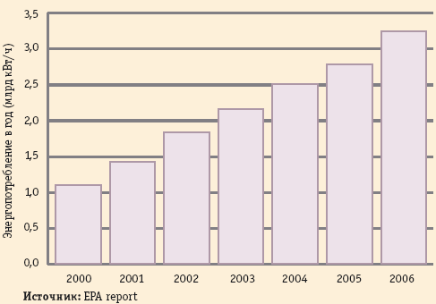 Как видно из рис. 1, запоминающие устройства потребляют все больше электроэнергии. И хотя технологии виртуализации, «тонкое распределение» (thin provisioning), массивы MAID (Massive Arrays of Idle Disks) и ряд других помогают снижать энергопотребление, постоянный рост тарифов будет приводить к удорожанию стоимости владения. Анализ, проведенный недавно компанией Google, показал, что затраты на электропитание подобных систем стали превышать капитальные затраты на эти системы на протяжении их жизненного цикла. Можно ожидать новых разработок, направленных на экономию электропитания и отвода тепла для корпоративных центров обработки данных.