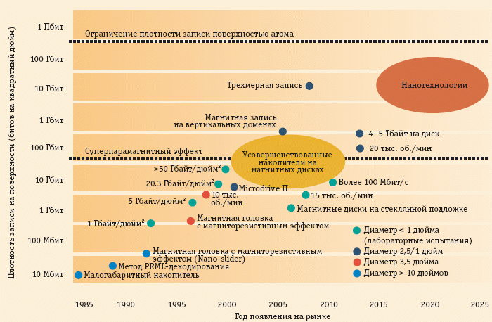 На рис. 2 приведена картина появления новых технологий, направленных на повышение плотности записи, определяющей, какое количество данных можно записать на одном квадратном дюйме носителя (гигабит на квадратный дюйм). Пока доминирует магнитная запись: использование технологии GMR (Giant Magneto-Resistive) для изготовления магнитных головок чтения/записи позволило магнитным дискам по показателю плотности записи в 1995 году превзойти оптические диски и вытеснить их с рынка корпоративных запоминающих устройств в сектор потребительских товаров и индустрии развлечений. Плотность записи на магнитные диски взлетела с 35,3 Гбит/дюйм2 в 1999 году до 610 Гбит/дюйм2 в 2008 году. Это стало возможным в результате применения технологии CPP-GMR (perpendicular-to-the-plane giant magneto-resistive), способной ежегодно повышать плотность записи еще на 40%. При таком темпе роста это повышение приведет к появлению дисков формата 3,5 дюйма и емкостью 4 Тбайт уже в 2010 году. К этому времени вертикальный способ записи быстро вытеснит горизонтальный и станет общепринятым. С помощью вертикального способа записи можно намагничивать вертикальные магнитные домены, делая запись битов как бы сверху вниз и снизу вверх. За горизонтом вертикального способа записи уже маячит концепция трехмерной (или объемной) технологии записи — 3-D Recording, предоставляющей возможность перехода от однослойной вертикальной записи к многослойной, что приведет к смене единиц измерения плотности записи.