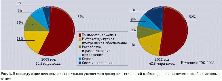 Сторонники вычислений в облаке особо подчеркивают их преимущества: снижение затрат, высокая готовность и масштабируемость. Согласно прогнозам IDC, расходы на ИТ-сервисы из облаков (рис. 1) вырастут с 16 млрд в 2008 году до 42 млрд долл. в 2012-м. Аналитики считают, что на долю вычислений в облаке придется 25% годового увеличения расходов на ИТ к 2012 году.