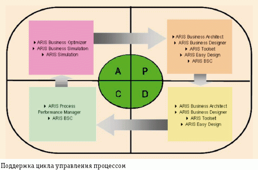 Одной из таких платформ является IDS Scheer ARIS (ARchitecture of Integrated Information Systems), предназначенная для структурированного описания, контроля, анализа и последующего совершенствования бизнес-процессов предприятия. Программные продукты ARIS поддерживают все этапы цикла управления процессом (Plan-Do-Check-Action, PDCA; см. рисунок): планирование деятельности через идентификацию целей компании и регламентацию бизнес-процессов; выполнение работ в соответствии с заданными в регламентах нормами; контроль степени достижения целей и качества бизнес-процессов; анализ ключевых показателей деятельности и инжиниринг бизнес-процессов. Кстати, одним из требований стандарта ISO 9001 является реализация управлении бизнес-процессами по PDCA-циклу.