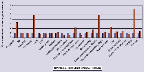 Рис. 2. Сравнительная производительность «Эльбрус-3М1» с микропроцессором «Эльбрус»/300 МГц и Pentium 4/1400 МГц на задачах пользователей