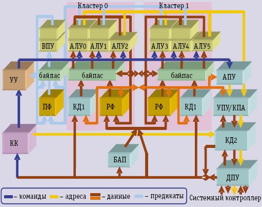 Структура микропроцессора «Эльбрус» (рис. 1) почти повторяет E2k. Шесть арифметико-логических устройств разделены между двумя кластерами с собственной копией регистрового файла и кэш-памяти первого уровня, причем содержимое обеих копий совпадает. Для повышения параллелизма на некоторых арифметико-логических устройствах можно запустить пару зависимых операций. Использование однобитовых предикатов приводит к сокращению операций передачи управления, а спекулятивное выполнение операций позволяет избавиться от ложных зависимостей и тем самым повысить производительность, достигая времени выполнения критических путей для программ со сложной логикой управления и ограниченным параллелизмом. Устройство вычисления адресов и предварительной асинхронной подкачки данных позволяет скрыть задержки, нарушающие подготовленное компилятором планирование операций, а аппаратная поддержка программной конвейеризации циклов позволяет полностью загрузить наиболее критические устройства исполнения.