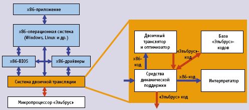 «Эльбрус-3М» обеспечивает полную двоичную совместимость с архитектурой IA-32 на базе технологии скрытой (невидимой пользователю) динамической двоичной трансляции со специальной аппаратной поддержкой (рис. 3). Основные компоненты данной технологии: