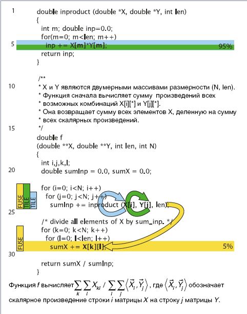 Известно несколько инструментальных средств профилирования кэша, таких как Intel VTune, Cprof и Cachegrind, определяющих области, в которых происходит большая часть безрезультативных обращений. На рисунке показан пример использования разработанного авторами инструмента профилирования повторного использования, названного ими «советами по оптимизации локальности» (suggestions for locality optimizations). Горизонтальные подсвеченные блоки показывают строки исходного кода с безрезультативными обращениями в кэш – 95% таких обращений произошло в строке 5 функции inproduct. Естественно попытаться переписать эту функцию для обеспечения лучшей производительности кэша.