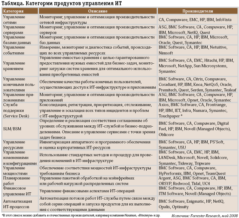 Аналитики Forrester Research к рынку систем управления ИТ относят все программные продукты, предназначенные для мониторинга, обнаружения и идентификации любого несоответствующего норме поведения ИТ-инфраструктуры: системы управления сетями, серверами, производительностью баз данных, работой конечных пользователей, приложениями, событиями, мощностями. Кроме того, к программному обеспечению управления ИТ относятся решения по контролю самой инфраструктуры (управление ресурсами, управление изменениями и конфигурациями), ее поддержке и эксплуатации (планирование, управление потоками работ), коммуникации ИТ-службы внутри себя и с бизнес-подразделениями (служба поддержки, управление уровнем обслуживания, управление бизнес-сервисами). ИТ-инфраструктура, которую контролирует ПО управления ИТ, включает в себя платформы (клиентские, серверные, операционные системы), программное обеспечение промежуточного слоя, приложения и объединяющую все эти компоненты друг с другом сетевую среду.