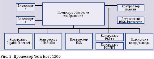 Оба процессора Tera Processor имеют похожую архитектуру и различаются тем, что у Tera Host 1200 два видеовыхода, а у Tera Portal 1100 симметрично два видеовхода (рис. 2). У них идентичные ядра Image Engine, предназначенные для компрессии и декомпрессии, и практически одинаковые подсистемы ввода/вывода плюс одинаковый центральный процессор MIPS32 24Kc Pro.