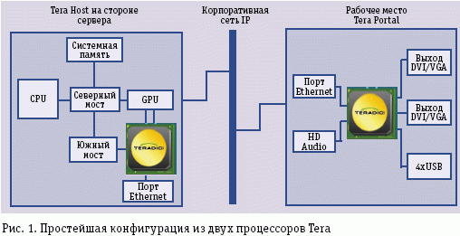 Вариант связи между рабочим местом и удаленным ПК на сервере в приложении к простейшему случаю показан на рис. 1. Cерверный Tera Host Processor включен в классическую конфигурации рабочей станции, связан одним или двумя каналами с графическим процессором и по PCI Express – с периферией типа USB и HD Audio. Совмещая получаемые и передаваемые данные, он в реальном времени смешивает компрессированный поток видеоданных с трафиком от USB и HD Audio и передает в виде пакетов по IP. На клиентской стороне Tera Portal Processor распаковывает пакеты PC-over-IP и распределяет их по видео-, аудио- и USB-интерфейсам. Процедура упаковки, передачи и восстановления обычно занимает менее 10 миллисекунд, такая задержка пользователем не ощущается. Никаких деталей о математических основах использованных алгоритмов компрессии компания не сообщает, утверждается лишь, что они обеспечивают надежную защиту от потери пакетов. Все коммуникации между рабочим местом и ЦОД шифруются при попомощи 128-разрядного алгоритма Advanced Encryption Standard.