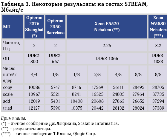 Таблица 3. Некоторые результаты на тестах STREAM, Мбайт/с