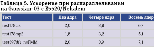 Таблица 5. Ускорение при распараллеливании на Gaussian-03 с E5520/Nehalem