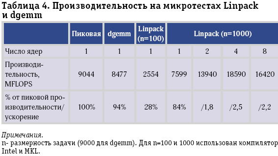 Таблица 4. Производительность на микротестах Linpack и dgemm