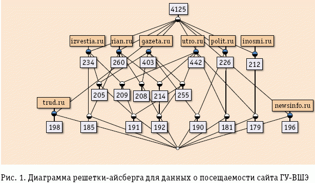 Любой владелец Internet-магазина хочет иметь представление об интересах посетителей его ресурсов – чем точнее получается портрет клиента, тем лучше может быть выстроена стратегия торговли. Частично это решается путем опросов и голосований по наиболее важным проблемам, но обычно отвечающих слишком мало, чтобы сформировать репрезентативную выборку. Компании, предоставляющие счетчики, обладают большей полнотой информации. И чем больше счетчиков у такой компании на других сайтах, тем больше возможностей у нее отслеживать поведение конкретных посетителей. Составление тематических каталогов, дополняющих счетчики ресурсов, помогает лучше понять интересы аудитории целевого сайта. Например, для бизнес-стратегии крупного банка важно понимать распределение интересов посетителей корпоративного сайта – потенциальных клиентов – по ресурсам финансовой тематики, представленным в тематическом каталоге. Крупному автодилеру не помешает знание интересов посетителей своего сайта, опять же в терминах профильной тематики, это позволит ответить на вопросы «Какими марками автомобилей сейчас интересуются потенциальные клиенты?», «Какого класса эти автомобили?», «Какие сайты конкурентов в этом секторе они еще посещают?» и т.п. Без тематических каталогов построение диаграмм решеток в терминах целевого сайта невозможно, но с помощью диаграмм решеток замкнутых множеств можно визуализировать данные о посещаемости целевого сайта в терминах распределения его аудитории по внешним ресурсам. На рис. 1 приведен пример такой визуализации, таксономии для данных о посещаемости сайта ГУ–ВШЭ в терминах новостных ресурсов.