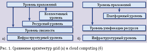 Архитектуры grid и облаков заметно различаются, поскольку создавались исходя из разных предпосылок. На первые повлияло стремление как можно эффективнее использовать дорогостоящие распределенные вычислительные ресурсы, сделать их динамическими и однородными. Поэтому архитектура сфокусирована на интеграции уже существующих ресурсов, включая оборудование и программное обеспечение, операционные системы, локальные средства, обеспечивающие управление и безопасность. В результате создается «виртуальная организация», ресурсы которой, переведенные в логическую форму, могут потребляться членами только этой организации. Существование этой организации поддерживается пятью уровнями протоколов, инструментами и сервисами, построенными поверх них (рис. 1а). Нижним является инфраструктурный уровень (fabric layer), объединяющий компьютеры, системы хранения, сети, репозитории кодов. Выше него расположен уровень связности (connectivity layer), на нем определены коммуникационные протоколы и протоколы аутентификации. Ресурсный уровень обеспечивает предоставление ресурсов, возможности управления ими, разделение между отдельными пользователями и оплату. Коллективный уровень (collective layer) дополняет ресурсный, позволяя оперировать наборами ресурсов. Уровень приложений (application layer) служит для поддержки приложений.