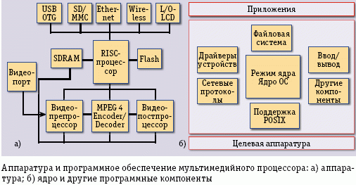 Аппаратура и программное обеспечение мультимедийного процессора: a) аппаратура; б) ядро и другие программные компоненты