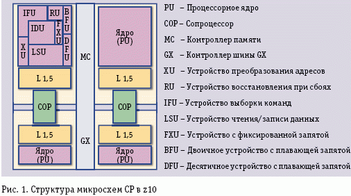 CP в z10 являются четырехъядерными, построенными по КМОП-технологии IBM c применением технологии «кремний на изоляторе» и с типоразмером 65 нм. CP содержит 993 млн транзисторов и имеет соответственно большую площадь – 454 кв. мм. Его 64-разрядные процессорные ядра (Processor Unit, PU) уникальны уже потому, что достигли наивысшей в своем классе тактовой частоты (более высокие характеристики только у RISC-процессоров Power6).