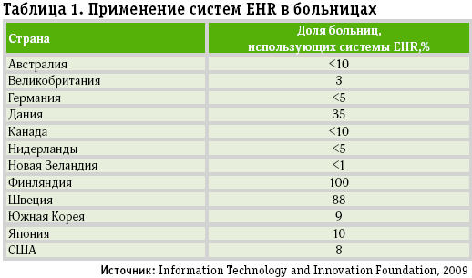 Таблица 1. Применение систем EHR в больницах