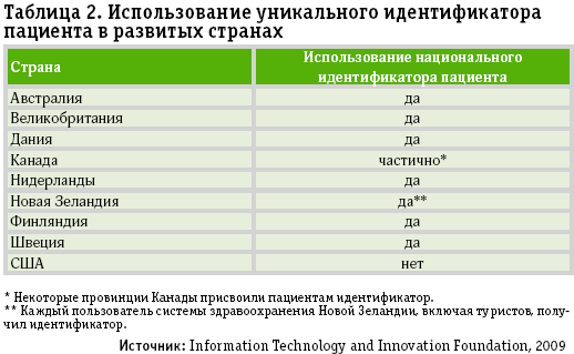 Таблица 2. Использование уникального идентификатора пациента в развитых странах