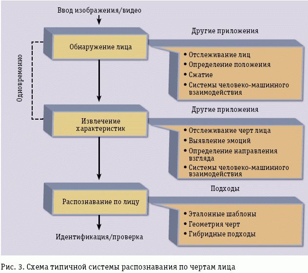 Типичная система распознавания по лицу (рис. 3) состоит из трех основных модулей: обнаружение лица, извлечение характеристик и распознавание по лицу. Как и при решении любой проблемы распознавания образов, различия в изучаемых изображениях из-за освещения, положения, выражения лица преодолеваются путем обеспечения инвариантности, или устойчивости по отношению к этим факторам на стадии извлечения характеристик или путем определения правил, позволяющих учитывать возможность таких различий на стадии распознания.