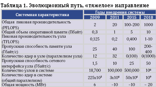 В таблице 1 приведены оценки специалистами Окриджской лаборатории эволюционного развития суперкомпьютеров «тяжелого» направления.