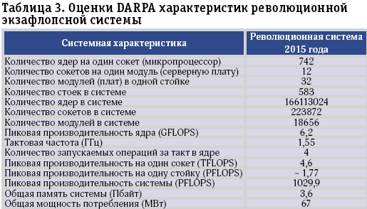Таблица 3. Оценки DARPA характеристик революционной экзафлопсной системы
