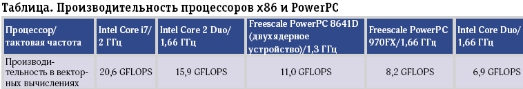 Появление серии Intel Core i3/i5/i7 на рынке встраиваемых систем было ожидаемо – горизонт планирования в процессорной отрасли составляет два года, и потому все, кто хочет подготовиться к приходу новых процессоров на основе информации из открытых источников, такую возможность имеют. Вместе с тем развитие по такому важнейшему эксплуатационному параметру, как производительность на ватт потребляемой мощности, вывело процессоры Intel Core i3/i5/i7 на новый уровень, позволяющий, в частности, всерьез говорить о конкуренции между x86-совместимыми чипами и чипами с микроархитектурой AltiVec. Благодаря увеличению числа ядер в одном корпусе и переходу на технологические процессы более высокого разрешения платформа x86 уже не уступает устройствам PowerPC не только по удельному быстродействию (см. рисунок), но и по абсолютной производительности (таблица).