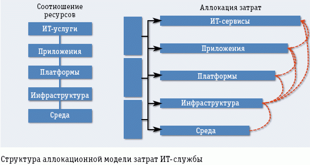 Далее, однако, возникает проблема. Архитектура ИТ обычно имеет ряд слоев: приложения, платформы, инфраструктура и среда ИТ, поэтому аллокацию затрат необходимо проводить послойно, начиная с инфраструктуры и кончая сервисами. Аллокация не обязательно проводится только на следующий слой (см. рисунок), но последовательность аллокации с каждого слоя снизу вверх должна быть соблюдена. Например, затраты на интернет-шлюз могут быть непосредственно отнесены на сервис Интернета, но это не отменяет необходимости аллокировать сначала среду, затем инфраструктуру, затем платформы и т.д. В результате каждый участник процесса описывает аллокацию затрат, за которые отвечает именно он, а послойная аллокация позволяет «собрать» затраты на сервисах.