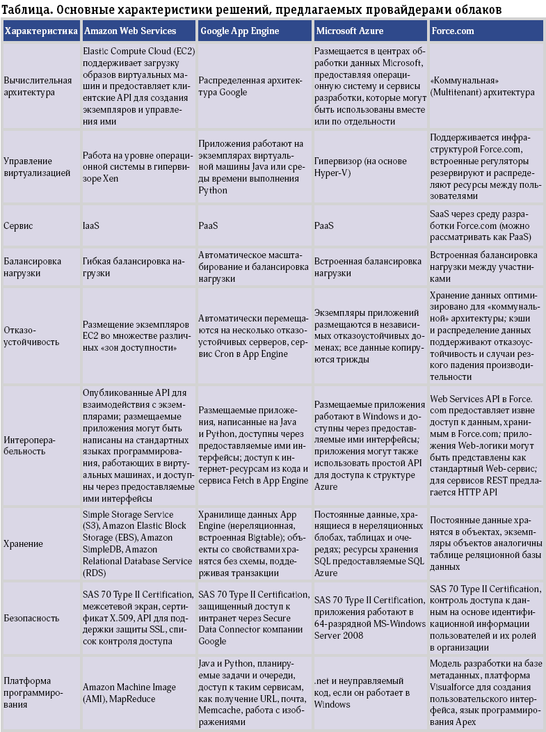 Провайдеры облачных сервисов постоянно выпускают новые решения, так что в определенном смысле бесполезно пытаться рисовать полную картину состояния дел в этой области, тем не менее, для иллюстрации, в таблице приведены сведения по четырем основным на сегодняшний день провайдерам облаков и даны некоторые ключевые характеристики их сервисов. Эти провайдеры предлагают решения во всем спектре: IaaS, PaaS и SaaS.