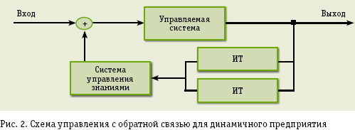 Очевидно, что в системах, построенных на перечисленных принципах, на равных должны участвовать люди, чей интеллект обладает динамичностью, способностью к принятию нетривиальных решений, не нуждается в предварительном программировании, но ограничен тем, что может удерживать в памяти одновременно не более семи объектов, и машины, способные тупо перемалывать гигантские объемы данных. В одну систему их могут объединить технологии, поддерживающие управление знаниями, в этом и состоит их главная интегрирующая роль. Управление знаниями может выступить в роли зонтика, под которым будут собраны отдельные камни-технологии. В таком случае классическая картинка управления по обратной связи (рис. 1) может трансформировать в другую (рис. 2). Участие человека позволяет заполнить зазор между моделью и реальной жизнью, наличие которого неизбежно в «грязных» системах управления бизнесом.