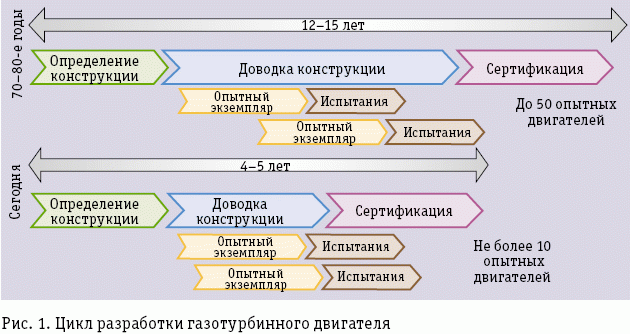 Еще недавно цикл проектирования нового авиационного газотурбинного двигателя составлял 12–15 лет (в два-три раза больше, чем цикл проектирования планера самолета), из которых собственно определение конструкции занимало не более двух лет, а все остальное время тратилось на экспериментальную доводку параметров. После изготовления первого опытного экземпляра проводились его испытания, проверялись технические характеристики и уточнялись параметры конструкции. Затем изготавливался следующий экземпляр, испытывался, вновь уточнялись параметры конструкции и т. д, до получения приемлемых характеристик. Например, при разработке двигателя АЛ-31Ф для истребителя Су-27 было построено и разрушено при испытаниях 50 полноразмерных опытных экземпляров, не говоря уже о различных испытаниях отдельных узлов и компонентов.