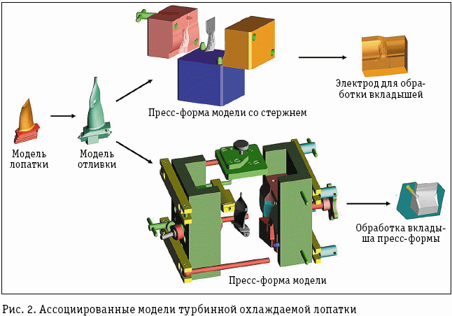 Принцип параллельного проектирования (concurrent engineering) базируется на использовании трехмерных мастер-моделей изделия и входящих в него деталей. Конечно, элементная модель для инженерных расчетов, чертеж детали, 3D-модель оснастки и программа обработки на оборудовании с ЧПУ строятся на основе конструкторской 3D-модели (рис. 2). При изменении исходной мастер-модели появляется возможность проследить по ассоциативным связям зависящие от нее объекты и произвести необходимые корректировки. В результате разработка процессов изготовления и необходимой оснастки может быть начата еще до окончательного утверждения конструкторской документации, что в итоге сокращает время проектирования.