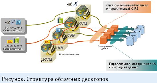 Данные пользователей хранятся в едином хранилище, доступ к которому осуществляется по протоколу CIFS. Это хранилище использует технологии параллельного Samba-сервера и кластерной файловой системы GPFS. Как видно из рисунка, одновременно используется множество систем хранения данных, при этом возможно добавление новых систем без остановки работы пользователей.