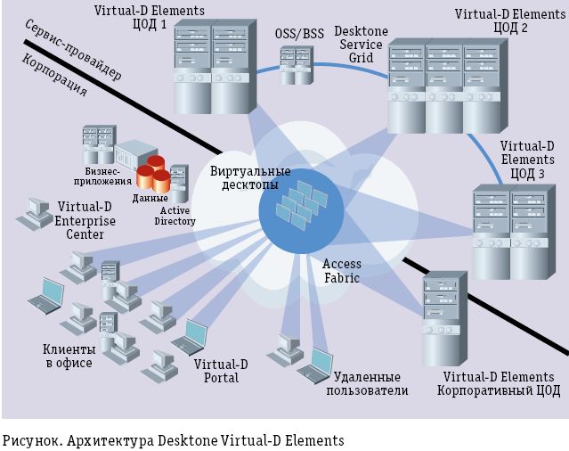Разработанный в Desktone подход к DaaS предполагает деление всей функциональности VDI на два уровня — корпоративный (Enterprise Tier) и уровень провайдера сервисов (Service Provider Tier), а также включает в себя связывающую их инфраструктуру Desktone Access Fabric, представляющую собой набор распределенных сервисов. Локальный обслуживающий персонал полностью не высвобождается, но меняются его задачи. На корпоративном уровне архитектура Virtual-D Platform оставляет ИТ-персоналу его обычные функции, но в приложении не к физическим десктопам, а к виртуальным устройствам — теперь в функцию ИТ входит автоматизация управления десктопами, управление жизненным циклом виртуальных машин, мониторинг и отчетность.