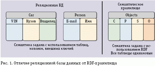 RDF и OWL упрощают обмен информацией между системами, определяя лишь спецификации, а не фиксированные модели. Вместе с тем реляционные базы получили большое распространение, и полностью отказываться от них сегодня вряд ли целесообразно. Одним из решений является организация доступа к реляционному хранилищу данных с помощью бизнес-логики хранилища, представленной в виде RDF; все таблицы, независимо от источника данных, имеют одинаковый формат (рис. 1).