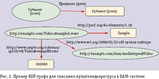 Приведем пример описания мультимедиаресурса в формате XML-RDF. Мультимедиаэлемент идентифицируется с помощью URI — http://example.com/Videos#sample1.wmv, предположим, что это видео, тогда тип идентифицируется как http://example.com/dam/mediatypes#Video. Зададим для этого элемента несколько свойств, например название: http://purl.org/dc/elements/1.1#title. Визуальное представление описываемого ресурса приведено на рис. 2.
