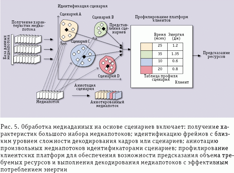 Рис. 5. Обработка медиаданных на основе сценариев включает: получение характеристик большого набора медиапотоков; идентификацию фреймов с близким уровнем сложности декодирования кадров, или сценариев; аннотацию произвольных медиапотоков идентификаторами сценариев; профилирование клиентских платформ для обеспечения возможности предсказания объема требуемых ресурсов и выполнения декодирования медиапотоков с эффективным потреблением энергии.