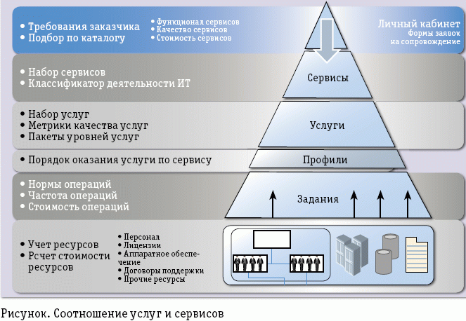На вершине пирамиды находится заказчик, которому доступны сервисы – конкретная информационная система или инфраструктура, предоставляемые в соответствии с соглашением об уровне обслуживания (Service Level Agreement, SLA).