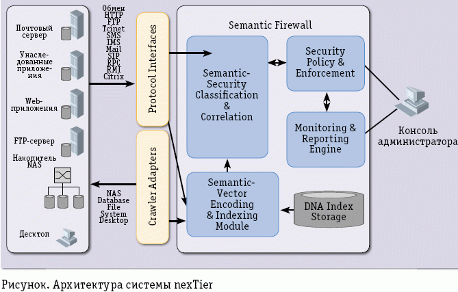 По своему исполнению семантический экран nexTier Semantic Firewall (см. рисунок) больше всего похож на программный спецсервер (software appliance), работающий на стандартных аппаратных средствах. Он естественным образом включается в имеющуюся сетевую инфраструктуру и инфраструктуру обеспечения безопасности. Этот сервер состоит из шести основных компонентов, первые два из которых являются служебными.