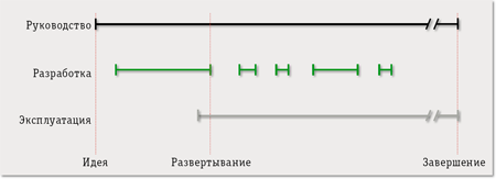 Чеппел развертывает картину жизненного цикла в линейную (рис. 2), выделяя три основные области ALM – руководство (governance), разработка (development) и эксплуатация (operations). Соответствующие этим областям процессы протекают, перекрываясь, от зарождения идеи нового приложения или модернизации существующего к этапу его развертывания до полного завершения функционирования.