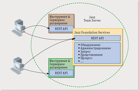 Ядром Jazz является платформа Jazz Foundation, объединяющая сервер Jazz Team Server и ряд дополнительных модулей интеграции. Jazz Team Server демонстрирует новый для ALM подход к интеграции компонентов для разных этапов жизненного цикла (рис. 3). Если традиционно такая интеграция базировалась на точечной связи между отдельными продуктами, то в Jazz реализована открытая распределенная сервисная архитектура на базе стандарта REST, которая обеспечивает простое взаимодействие инструментальных компонентов между собой (своего рода ALM Web). Интерфейс RESTful позволяет представлять в виде сервисов данные и функциональность разнообразных модулей. Использование подхода на базе стандартов Web обеспечивает хорошую масштабируемость Jazz, делая платформу универсальным решением, способным поддерживать задачи ALM в небольших командах и в крупных коллективах разработчиков.