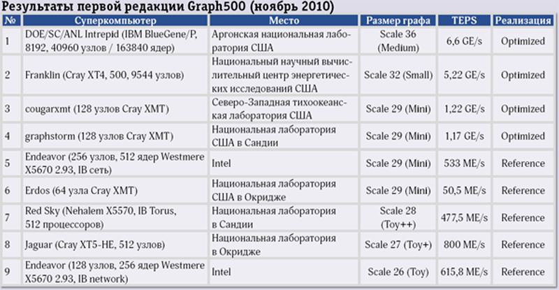 Пока в списке Graph500 всего девять суперкомпьютеров (см. таблицу), но даже при таком небольшом количестве удивляет разнообразие представленных архитектур. На первом месте - IBM BlueGene/P, на котором при использовании 8192 узлов получено 6,6 GE/c для графа medium (17 Тбайт). На втором месте с результатом 5,22 GE/c на графе small (1 Тбайт) довольно старый суперкомпьютер Cray XT4 с узлами на базе коммерческого процессора AMD Opteron и коммуникационной сетью Cray Seastar2. Оба этих суперкомпьютера имеют заказные сети с топологией 3D-тор.