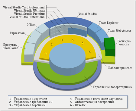 Все три этапа жизненного цикла (проектирование, реализация и эксплуатация) неразрывно связаны между собой и могут накладываться друг на друга во времени. Соответственно и инструменты, поддерживающие эти процессы, должны быть интегрированы между собой и обеспечивать непрерывный и своевременный обмен информацией вне зависимости от того, где географически находятся люди, его использующие и какие методологии разработки они применяют. Главной целью создания набора инструментов семейства Visual Studio 2010 было предоставление каждому участнику процесса понятного и простого инструмента взаимодействия с другими участниками, а также интеграция с такими инструментами, как Microsoft Office, SharePoint и Internet Information Server, применение которых позволяет воспользоваться уже готовой программной инфраструктурой.