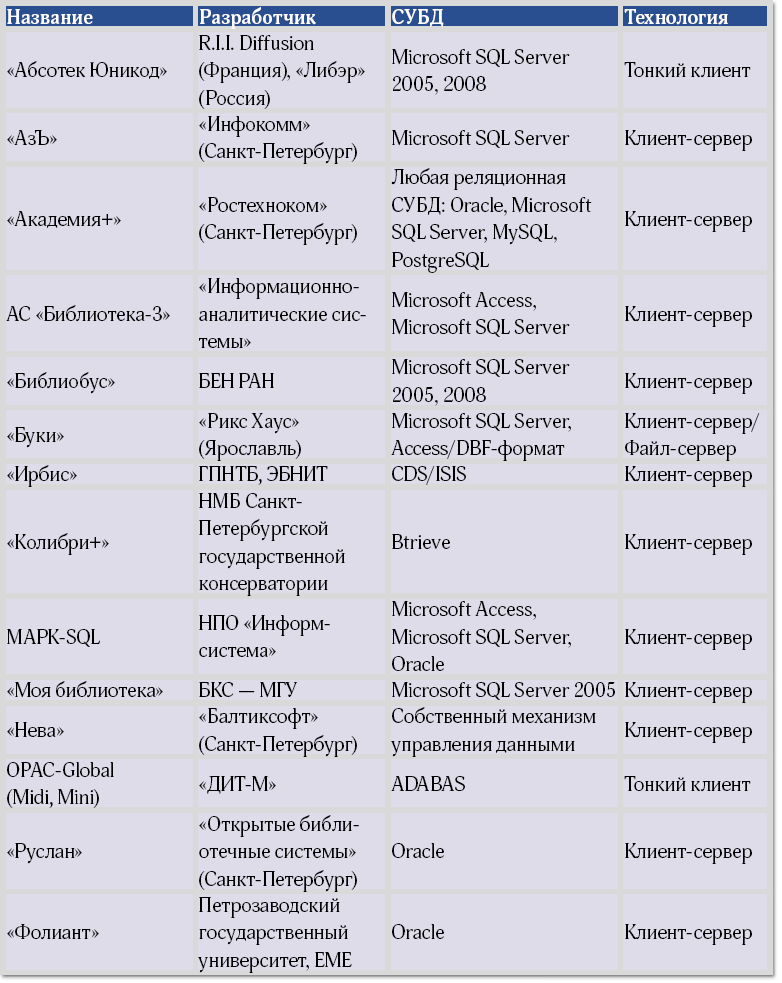 На российском рынке имеется более десятка АИБС (табл. 1), реализующих, как правило, АРМ библиотекаря. Дополнительно к АИБС может быть поставлен OPAC (Online Public Access Catalog) – модуль доступа к электронному каталогу библиотеки через Сеть. Исключение составляет система OPAC-Global (Midi, Mini), в которой соединены и АРМ библиотекаря, и читательский интерфейс доступа к каталогу.
