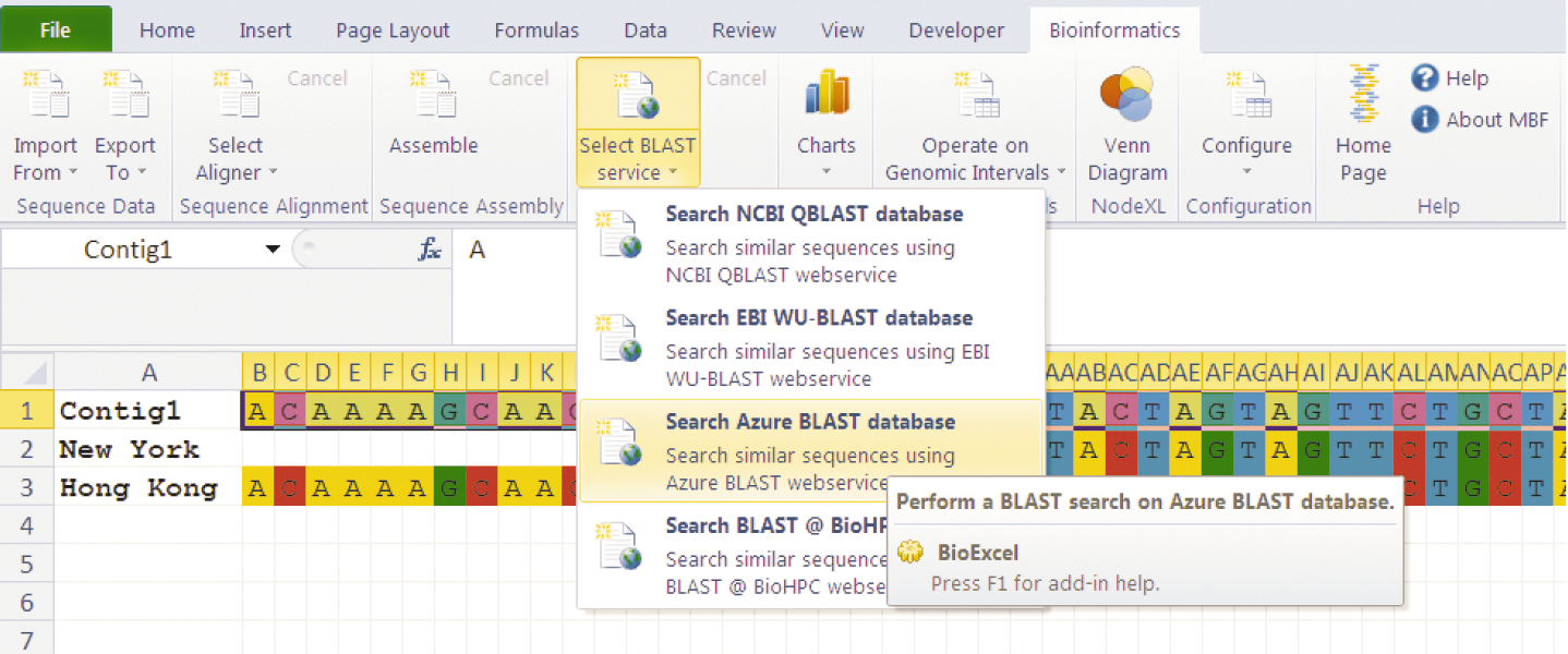 Несмотря на полезность веб-портала, его все же нельзя полностью назвать приложением, интегрированным с облаком. А что если использовать электронную таблицу не как локальное хранилище данных, а как окно в большую таблицу в облаке? На рисунке показан прототип расширения Excel, связанный с NCBI BLAST, работающим в Windows Azure: пользователи могут вводить цепочки ДНК непосредственно в электронную таблицу и запускать удаленные вычисления. Результаты хранятся в облаке и могут добавляться обратно в таблицу.