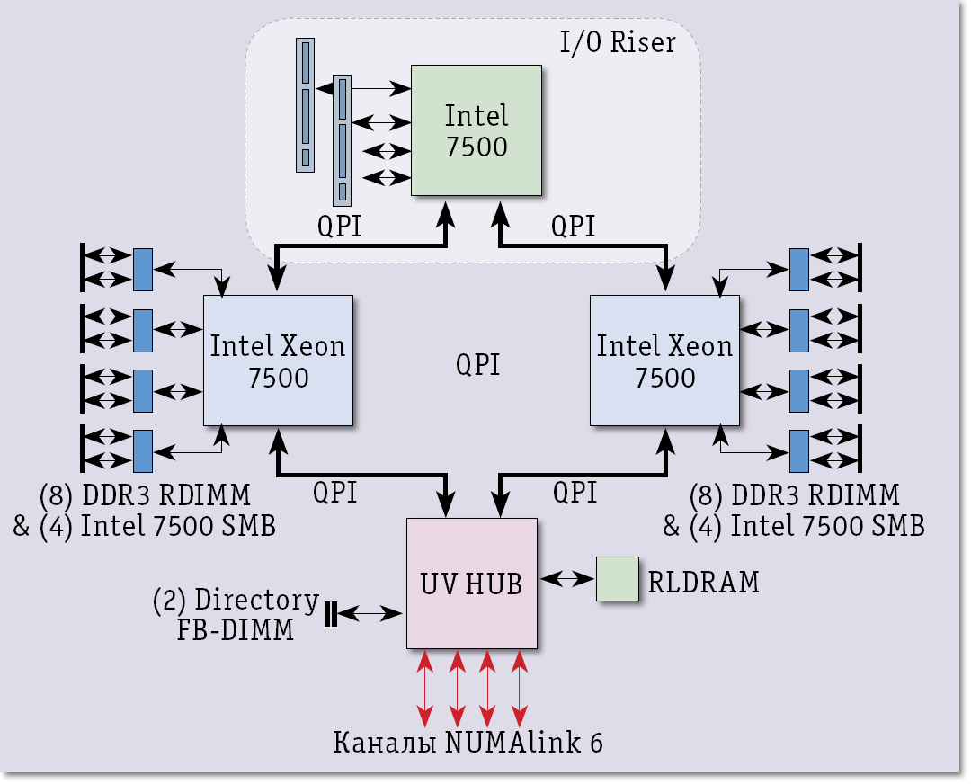 Для обеспечения когерентности кэша в больших ccNUMA-системах еще со времен серверов Origin применяется подход на основе каталогов — UV_Hub использует для этого память на FB DIMM (рис. 1), а для ускорения работы задействуется также дополнительная память RLDRAM [4,5].