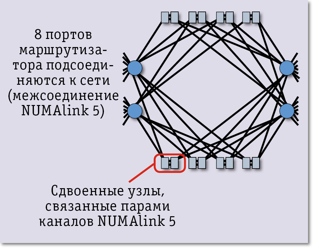Работу NUMAlink 5 обеспечивают 16-портовые маршрутизаторы, а для каналов применяются кабельные соединения. Одно шасси с узлами-лезвиями вмещает до 16 лезвий и имеет коммутаторную топологию (рис. 2), использующую спаренные узлы, связанные двумя каналами NUMAlink 5. Путь между любыми узлами занимает не более трех "прыжков".