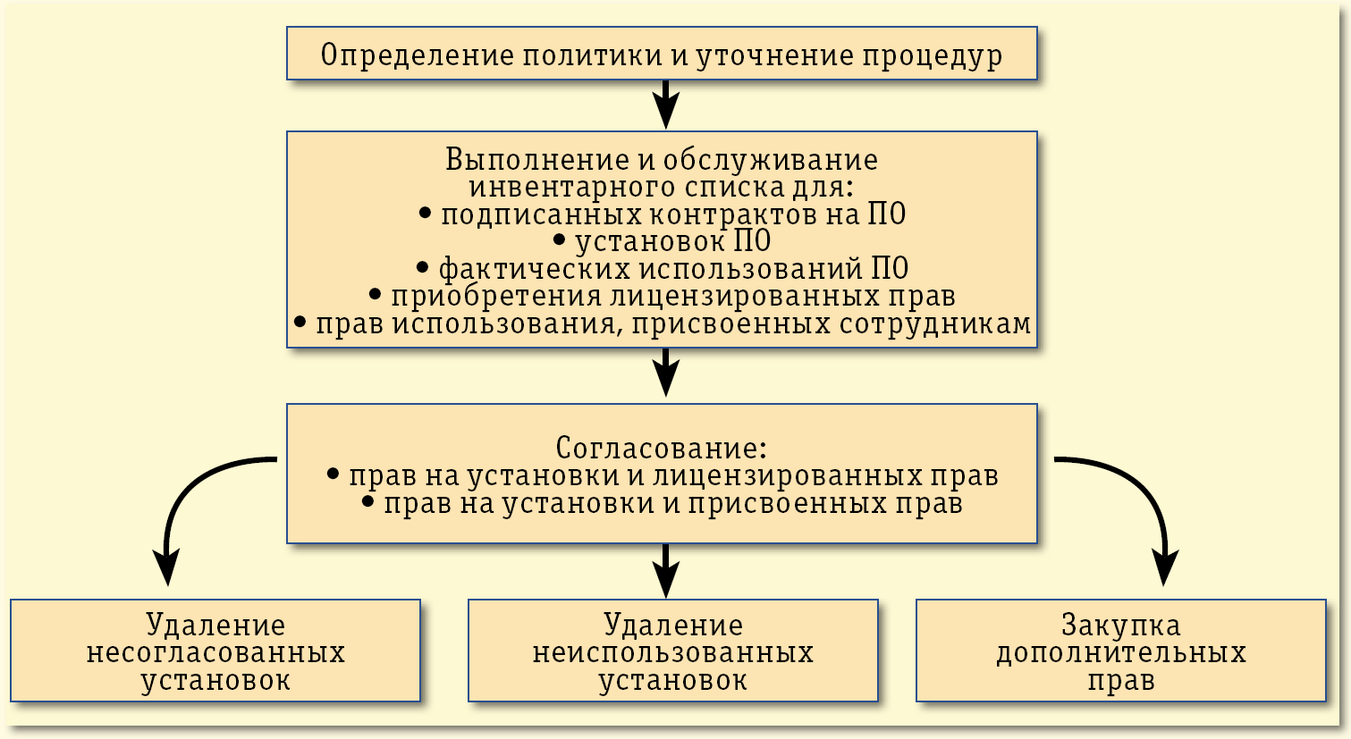 Сегодня под давлением законодательства многие предприятия обращаются к средствам инвентаризации ПО. Так, модуль Software Asset Management дает возможность: управлять лицензионными контрактами, выполнять процесс проверки контракта, создавать новые контракты, изменять существующие контракты, описывать лицензии, приобретенные у сторонних компаний и внутренние назначения прав, подсчитывать установки ПО, учитывать фактическое использование программного обеспечения, согласовывать лицензии и установки, сравнивать лицензии и установки или полномочия и установки, обрабатывать несогласованности. На рисунке приведена схема процедуры учета программных активов.