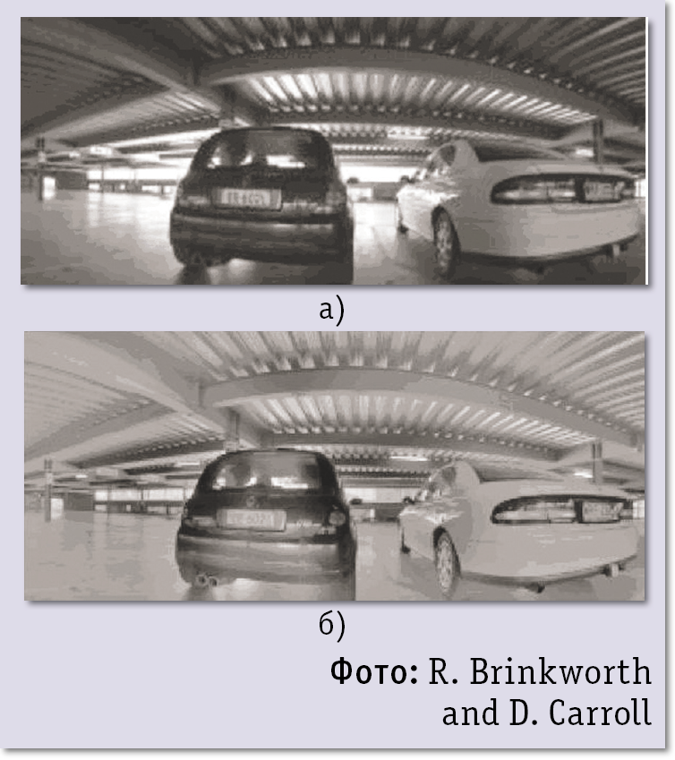 | Рис. 5. Нормализация слишком контрастного снимка крытой автостоянки. (а) В результате стандартной компрессии фотоснимка (по алгоритму. jpeg) теряются детали изображения в очень затененных и ярких областях. (б) Алгоритм Retinex, реализованный средствами Cog, восстанавливает утраченные детали, сохраняя общую контрастность изображения (Фото: R. Brinkworth and D. O’Carroll). |